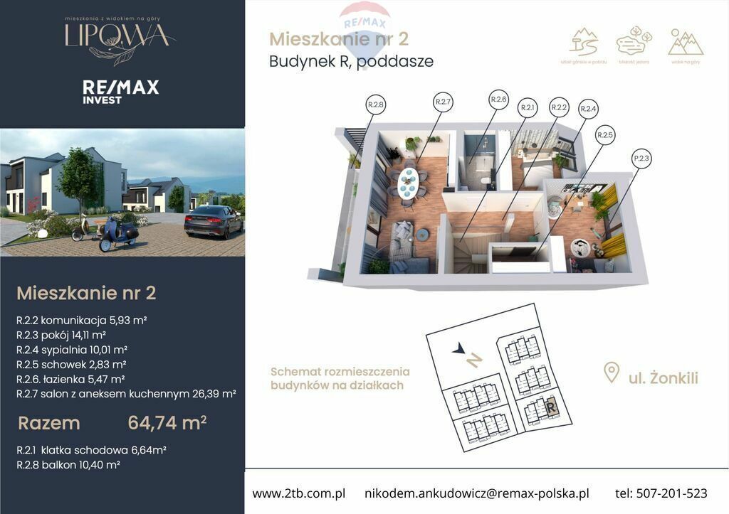 - 64,74 m2 powierzchni użytkowej,